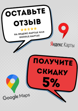 Оставьте отзыв о нашей компании на Яндекс.Картах или Google.Картах, и мы вышлем Вам дисконтный код на скидку 5%*